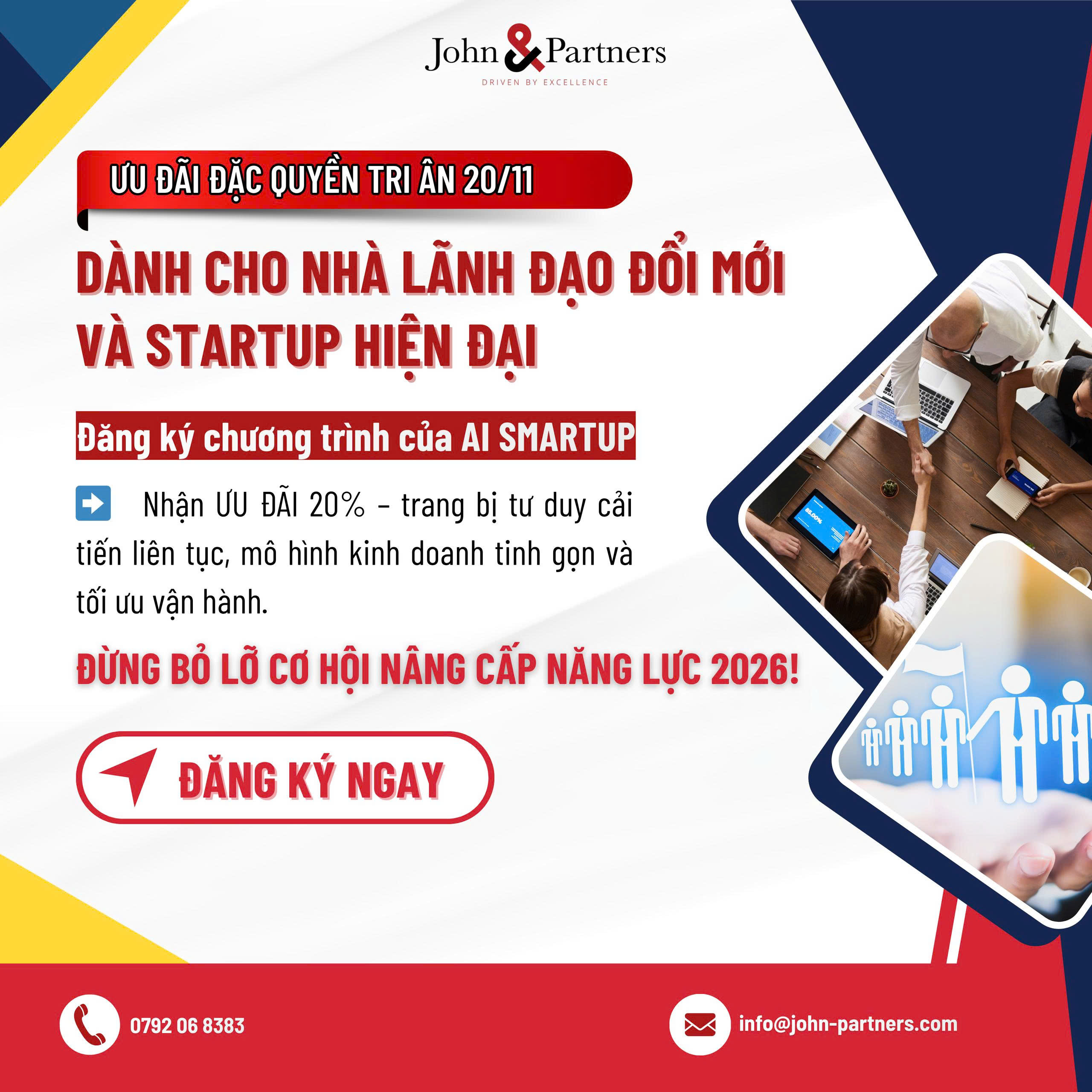 Và để lan tỏa tinh thần biết ơn ấy, John&Partners gửi đến cộng đồng doanh nhân – lãnh đạo – chuyên gia chương trình ưu đãi lớn nhất tháng 11, như một lời tri ân và một nguồn lực thiết thực để cùng nhau bước vào năm 2026 tự tin hơn, bản lĩnh hơn.