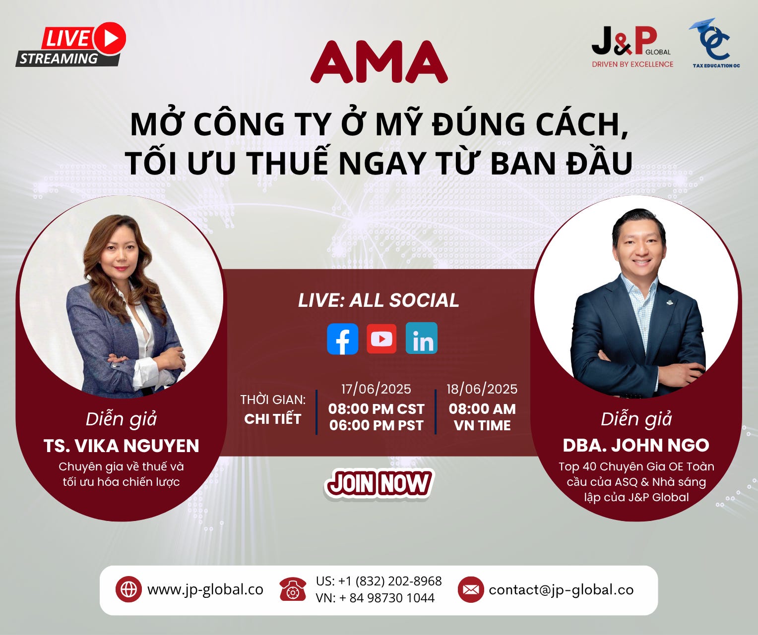 Hãy tham gia hội thảo MIỄN PHÍ trực tuyến của J&P Global, nơi các chuyên gia hàng đầu sẽ chia sẻ những chiến lược quan trọng về cách mở công ty tại Mỹ đúng cách, đặc biệt là việc tối ưu thuế ngay từ giai đoạn đầu.