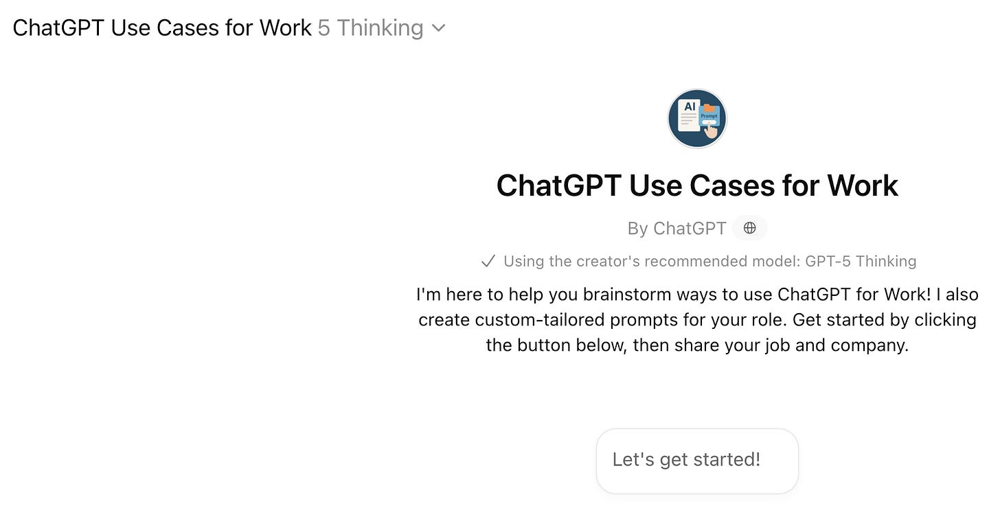 I’m here to help you brainstorm ways to use ChatGPT for Work! I also create custom-tailored prompts for your role. Get started by clicking the button below, then share your job and company.